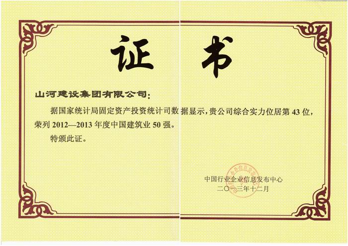 由国家统计局提供最新权威数据支持,中国行业企业信息发布中心主办的“2013第十二届中国建筑业50强测评成果发布暨颁奖典礼”于2013年12月在京举行。会上发布了中国建筑业50强名单,山河集团位居第43名,提前两年实现了山河集团 “二五”目标中的该项指标。