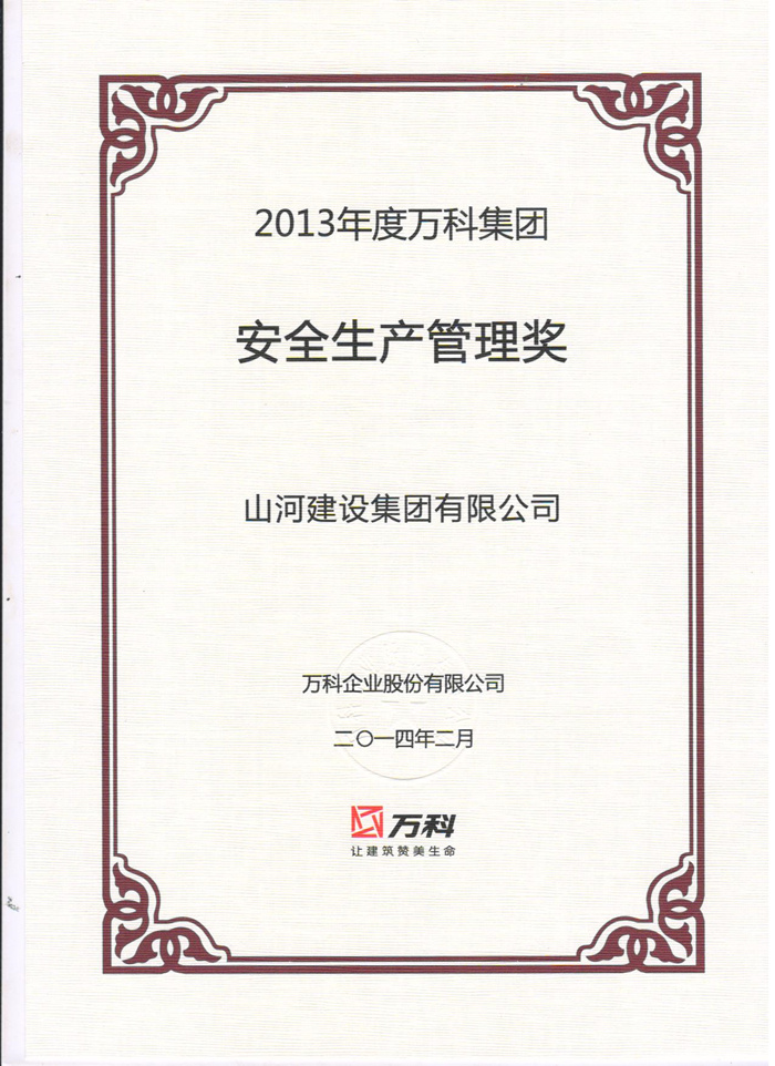 春茗会上,万科集团首次向公众发布了“2013年度合格供应商名录”,覆盖了总承包、监理、装修总包、门窗、景观、基础工程、材料设备七大类供应商共计824家企业,山河建设集团有限公司获得“万科企业合格供应商”称号,项目经理马文敏代表集团公司获评“安全生产管理奖”。