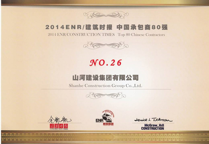 美国《工程新闻记录》(ENR)和中国《建筑时报》两家权威媒体共同主办的2014年ENR/建筑时报“中国承包商80强和工程设计企业60强”排名于11月20日在北京揭榜。山河集团再次榜上有名,同比去年上升11位,排名列第26位,也是排行榜中湖北建筑企业第一名。