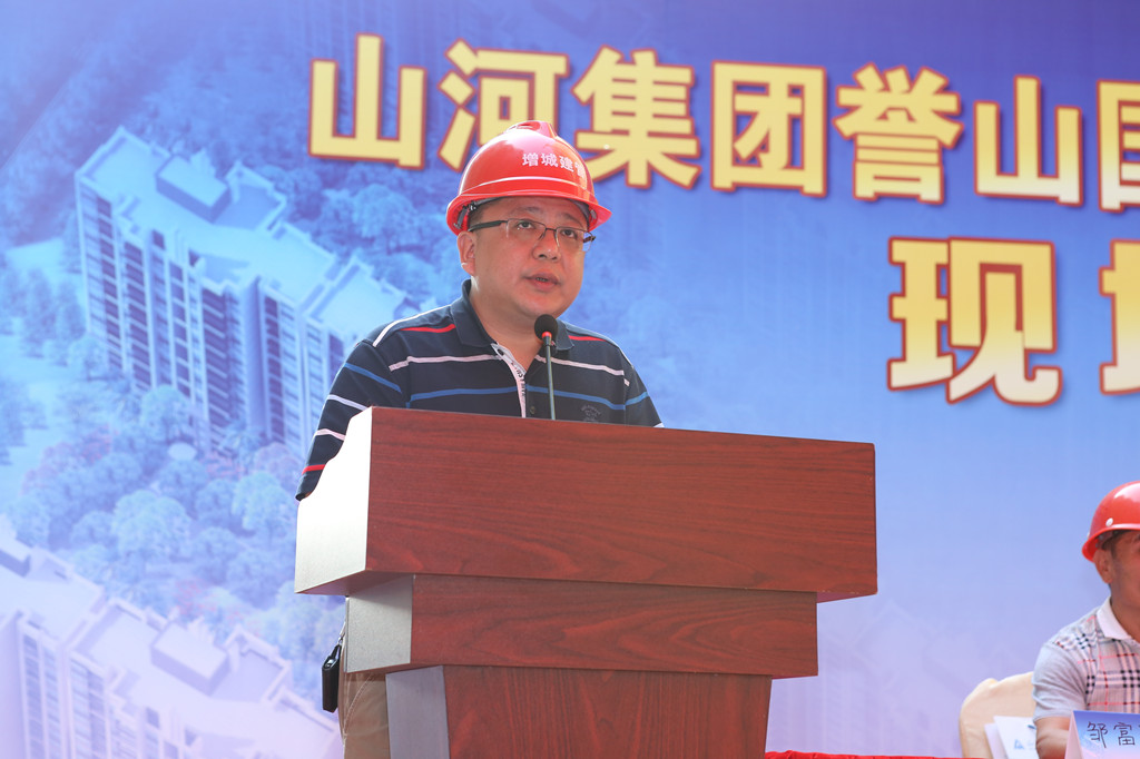随后,山河集团广东公司总经理李新军上台致辞。他首先向出席现场会的区建设局领导、主管部门领导以及业界同仁表示衷心的感谢。在致辞中,李总强调,山河集团誉山国际项目成功召开现场观摩会,得益于各级主管部门、各位领导对山河集团项目管理实践工作的充分支持和信任。他表示,山河集团将强化安全生产基础,大力实施绿色节能科技,为提升增城区建筑市场施工水平做出应有贡献。