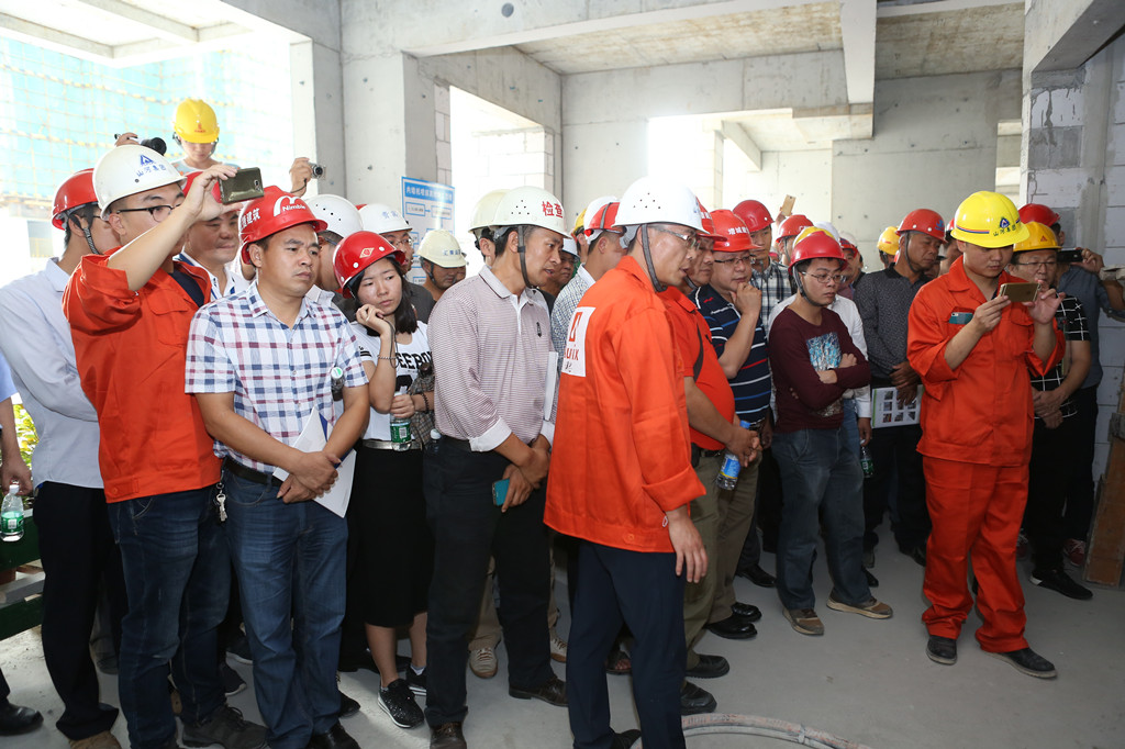 活动仪式结束后,参会领导和建筑业同行深入项目现场实地参观。观摩现场将建设过程各种工艺做成样板间,向参观者集中展示了山河集团在项目全过程中实施精细化、规范化、标准化管理的先进经验和做法。其中,高大支模质量管控、内墙机喷砂浆系统等安全、节能、环保技术得到了参观领导和同行人员的一致认可。“现场整洁、安全防护标准规范、定型化有利于周转,不愧是增城区建筑同行的学习标杆”,来自增城中森地产公司的王经理观摩后竖起大拇指。