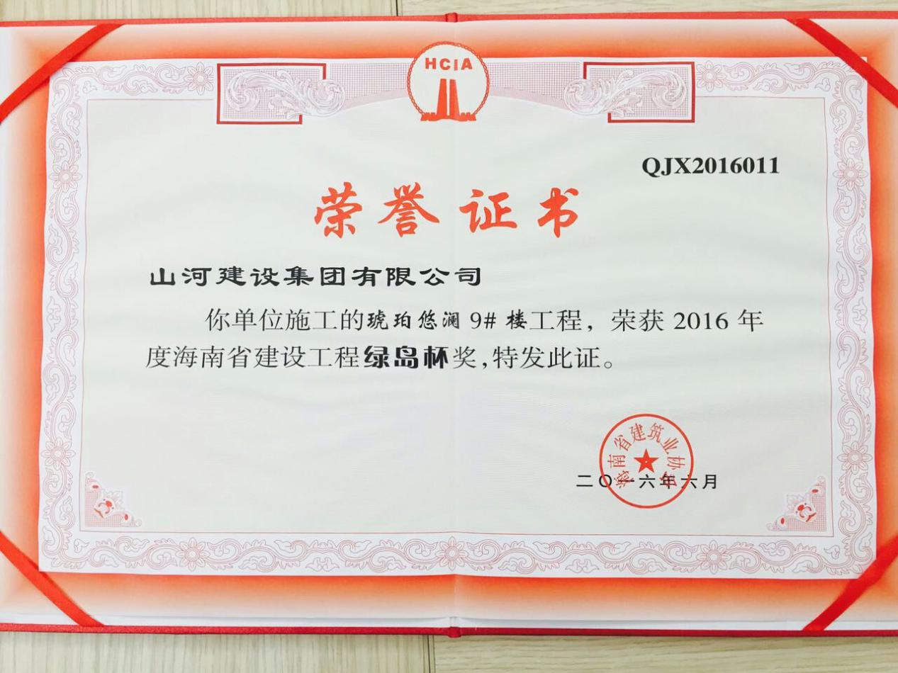 7月14日,海南省建筑业协会组织开展的2016年度海南省建设工程“绿岛杯”奖的评选工作已经结束,经过严格的评审和公示,山河集团海南公司承建的琥珀悠澜项目9#楼荣获海南省建设工程“绿岛杯”。
