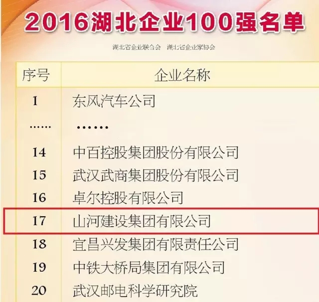 9月8日,2016湖北企业100强发布,东风汽车、中建三局、武钢集团位居前三甲,山河集团以304.85亿元的营业收入排名第17位,荣登湖北企业百强榜。