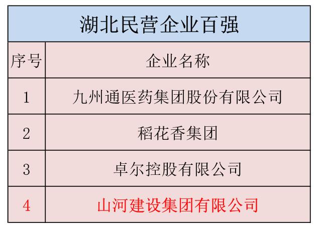 9月21日,由湖北省工商联主办的2016湖北民营企业100强发布会在洪山宾馆召开,山河集团以304.85亿元的营业收入位居第四。