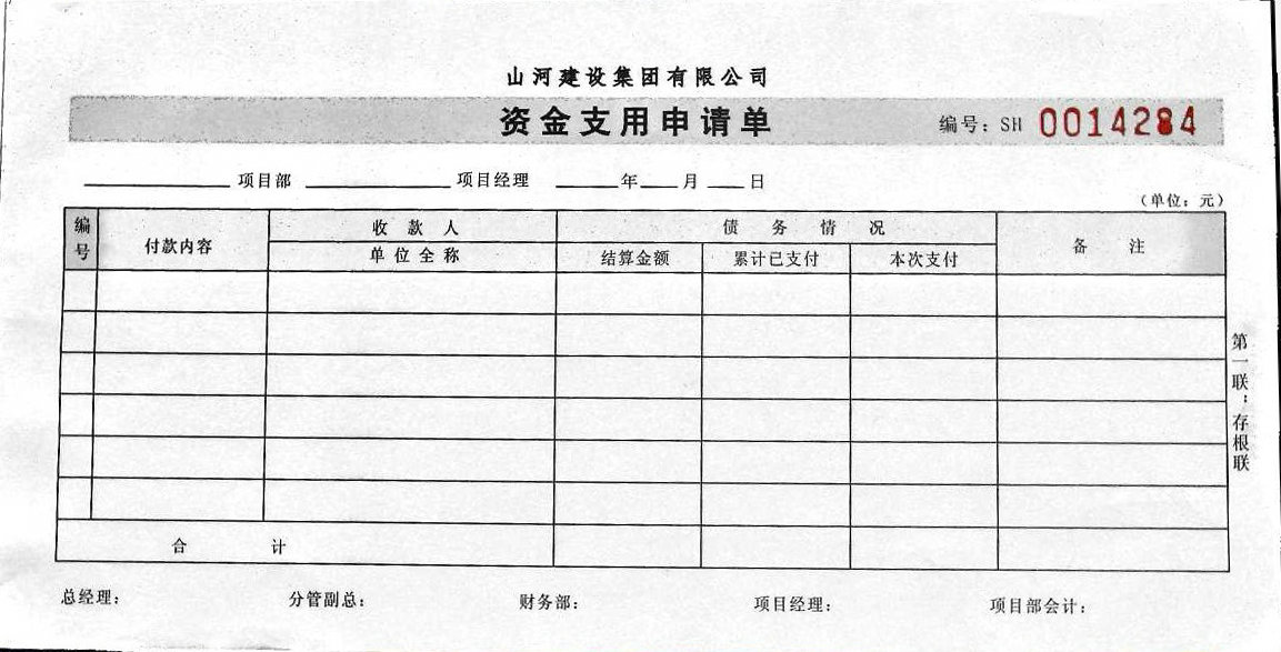 4、根据资金计划,分单位填制资金支用单,项目部财务人员对该过程把好关,即做好“六不支付”------不开收据不付款、没有结算或结算不够不付款、发票不够不付款(或预留相关税金)、委托支付不付款、签字手续不齐不付款、没有尾款承诺的不付款。