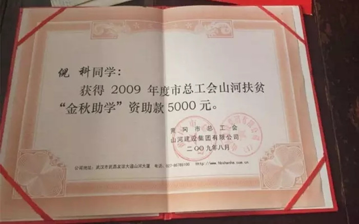 2009年,倪科获得山河集团5000元资助