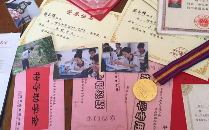 受助学生蔡玉祥获得的各种奖状及奖牌
