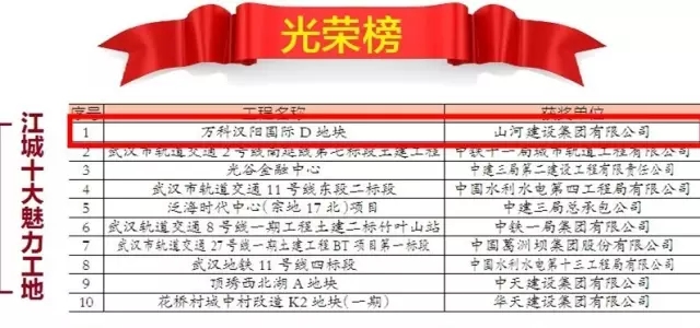 12月25日,2016年江城十大魅力工地十大智慧工地评选活动在楚天传媒大厦举行颁奖典礼,由山河集团承建的万科汉阳国际D地块项目位列十大魅力工地榜首,再获殊荣。