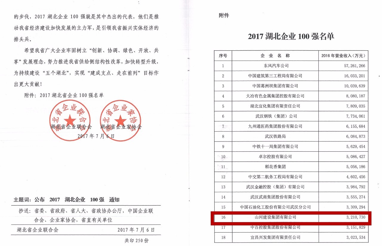 “荆楚风云汇,百强战鼓擂”。7月6日,湖北省企业联合会、湖北省企业家协会发布“2017湖北企业100强”榜单。山河集团2016年度以营业收入321.073亿元的实绩名列2017湖北企业100强第16位,较去年第17位又上升了1位。