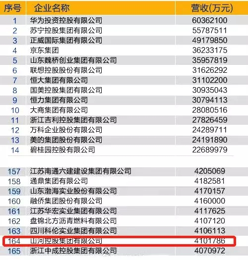 2018中国民营企业500强榜单发布! 山河集团位列第164位