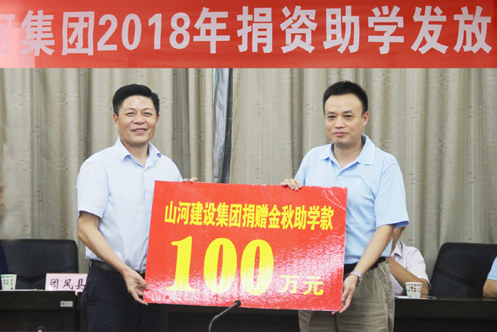 8月27日,山河集团2018年“山河扶贫助困教育基金”捐赠活动在团风县政府七楼会议室举行。当天,山河集团出资100万元,资助团风县百余名贫困大学生走进学堂。县人大常委会主任杜泉源,县政协主席易大安,县委常委、县委办主任丁永忠出席,副县长黄菊花代表县政府接过写有“山河扶贫助困教育基金100万元”的牌匾。