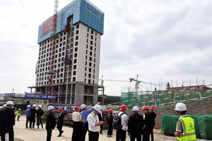 当天下午,与会人员来到天娇城四期项目工地,参观了售楼部和施工区、堆料区等。蓝光发展相关负责人对山河集团抓质量、保安全、促进度的各项做法给予了充分肯定,双方就项目的相关情况交换了意见。