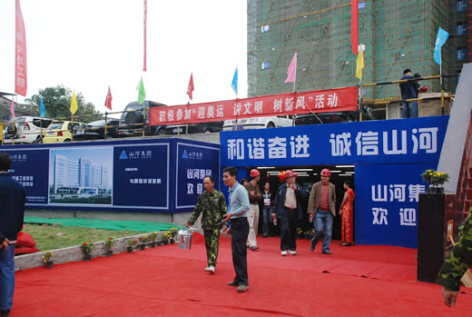 27日上午,武汉市政府、汉阳区区委、武汉市建委、市建管办等主管部门领导和嘉宾,以及各大媒体共500余人参加了此次大会。他们在现场看到了一个建设工程安全和文明施工都非常到位的项目部。在这里,工地上看不见一根随处乱放的钢管;生活区处处干净整洁,工人师傅在温馨如家的环境中休闲娱乐;办公室里各种文件资料分门别类摆放得整整齐齐……而这些不俗的表现,也是行政主管单位为什么会把现场观摩会放在山河集团项目部举行的原因。