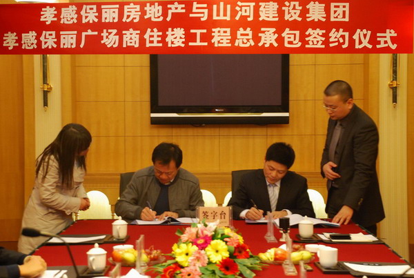 2009年11月23日下午5时,在美丽的东湖之滨,孝感保丽房地产与山河建设集团举行了“孝感保丽广场工程”总承包签约仪式。